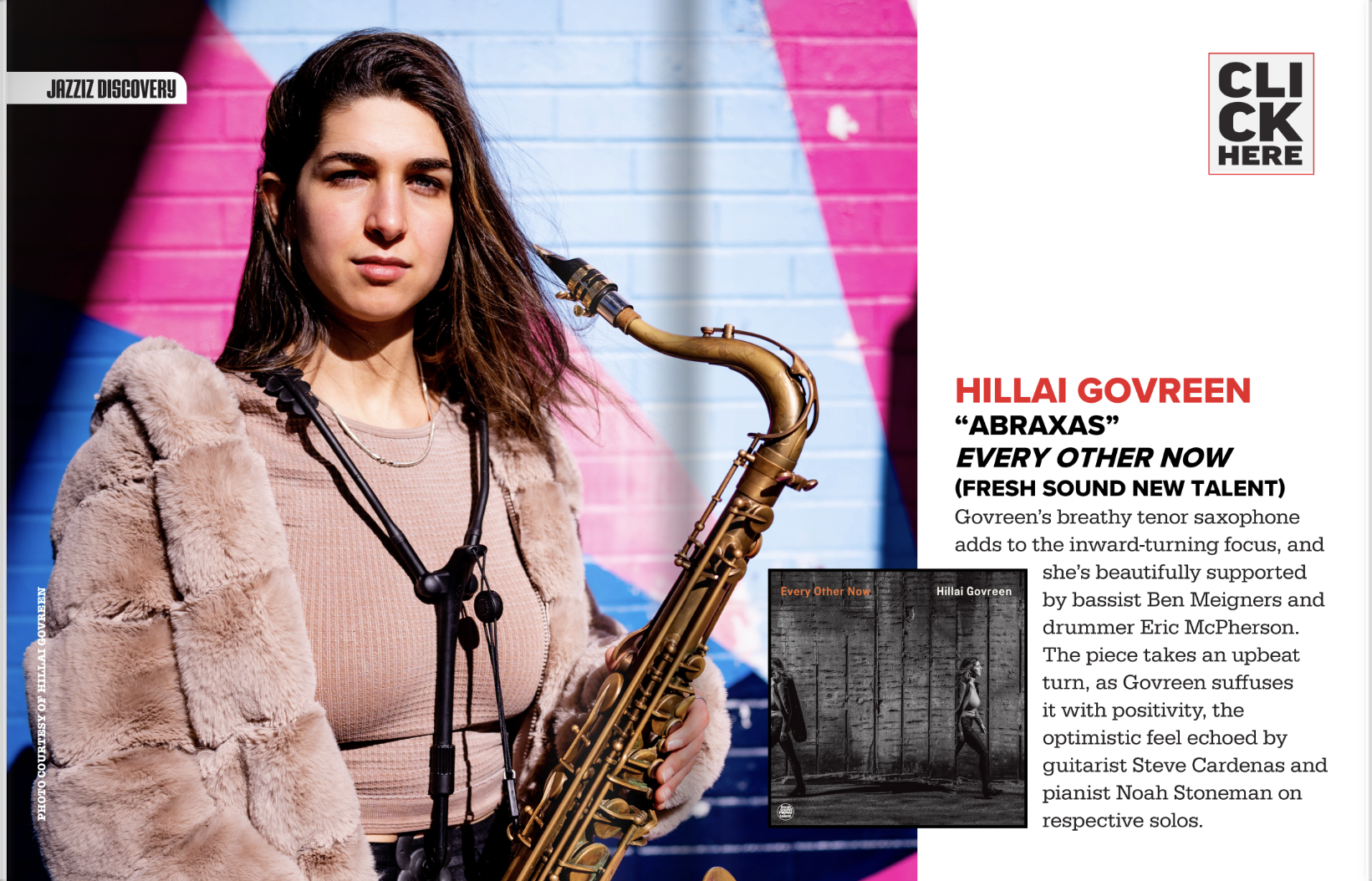 “With Every Other Now, Govreen firmly plants her flag in the next generation of jazz artistry. The album is deeply intellectual yet soulful, structured yet improvisational, familiar yet completely her own. It’s a testament to the power of personal voice—and a reminder that even without lyrics, music can speak with radical clarity.” -Savoir Magazine-
